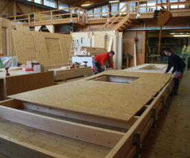 Two assembly tables in two buildings for prefabricating personalized single family homes. The whole roofs are laid out before cutting them into transportable units.